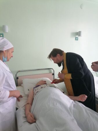 Сестры милосердия и священники продолжают духовное окормление пациентов 9-й городской клинической больницы. Молебен о здравии болящих отслужил ключарь Собора Святой Троицы протоиерей Павел Матюшин совместно с сестрами милосердия и добровольцами. Были совершены Таинства Исповеди и Причащения, а также Соборование для одной прихожанки храма села Гольяны. В одной из ординаторских совершено освящение для благословения врачебного труда.