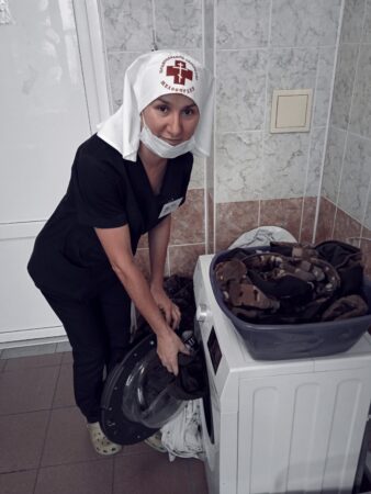 Каждый день начинался с заботы о бойцах. «Завтрак — это особенный момент. Лежачих кормим прямо в постели, а те, кто может ходить, приходят в столовую. Мы помогаем поднести и унести», — продолжает Максим. «После завтрака мы возим бойцов на процедуры и перевязки. Мужчины транспортируются на носилках и каталках. Когда есть эвакуация в другие города для более высокого уровня лечения, мы помогаем с подготовкой бойцов: переодеваем их, меняем памперсы и следим за тем, чтобы они были в комфортной одежде», — объясняет он.
